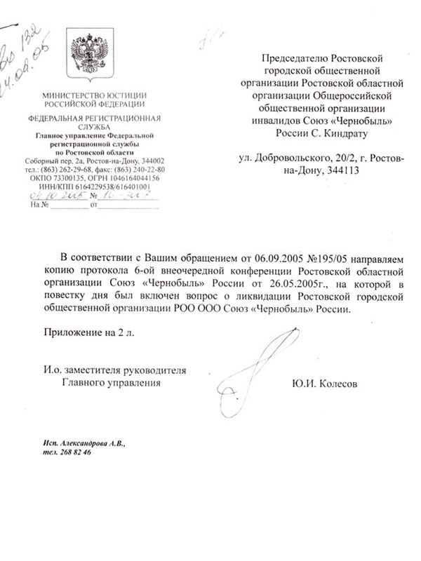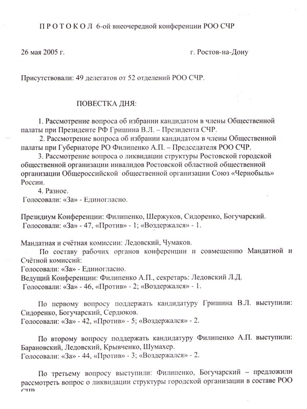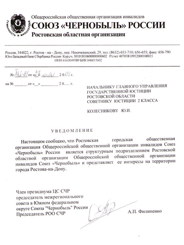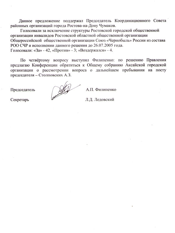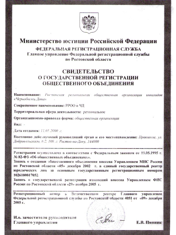 Таким образом, члены Ростовской городской организации оказались в подвешенном состоянии, в состоянии неопределенности, и надо было принимать решение. А именно : регистрировать городскую организацию под другим названием и по иным юридическим основаниям. В декабре 2005 года была зарегистрирована Ростовская региональная общественная организация инвалидов «Чернобылец Дона», которая явилась фактическим преемником ликвидированной городской организации Союз «Чернобыль» России [6].