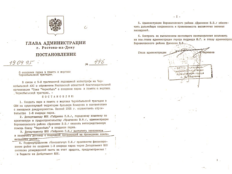 Со времени основания РРООИ «Чернобылец Дона» удалось сделать многое. Начиная с 1995 года в соответствии с Постановлением Главы Администрации г. Ростова-на-Дону № 446 проводились работы по созданию парка в память о жертвах Чернобыльской трагедии и одноименного Памятника в Северном жилом массиве на бульваре Комарова [7]. В актив можно занести и достигнутую системность в оказании медицинской помощи и санаторно-курортного лечения членам организации , и открытие Музея «Черная Быль Чернобыля» в 104-й школе в Северном жилом массиве, и преодоление сопротивления административной и судебной системы ( когда удалось добиться положительного решения по судебным искам в возмещение вреда здоровью и продовольственной компенсации и, что было не менее трудно, реального финансирования выигранных исков ).