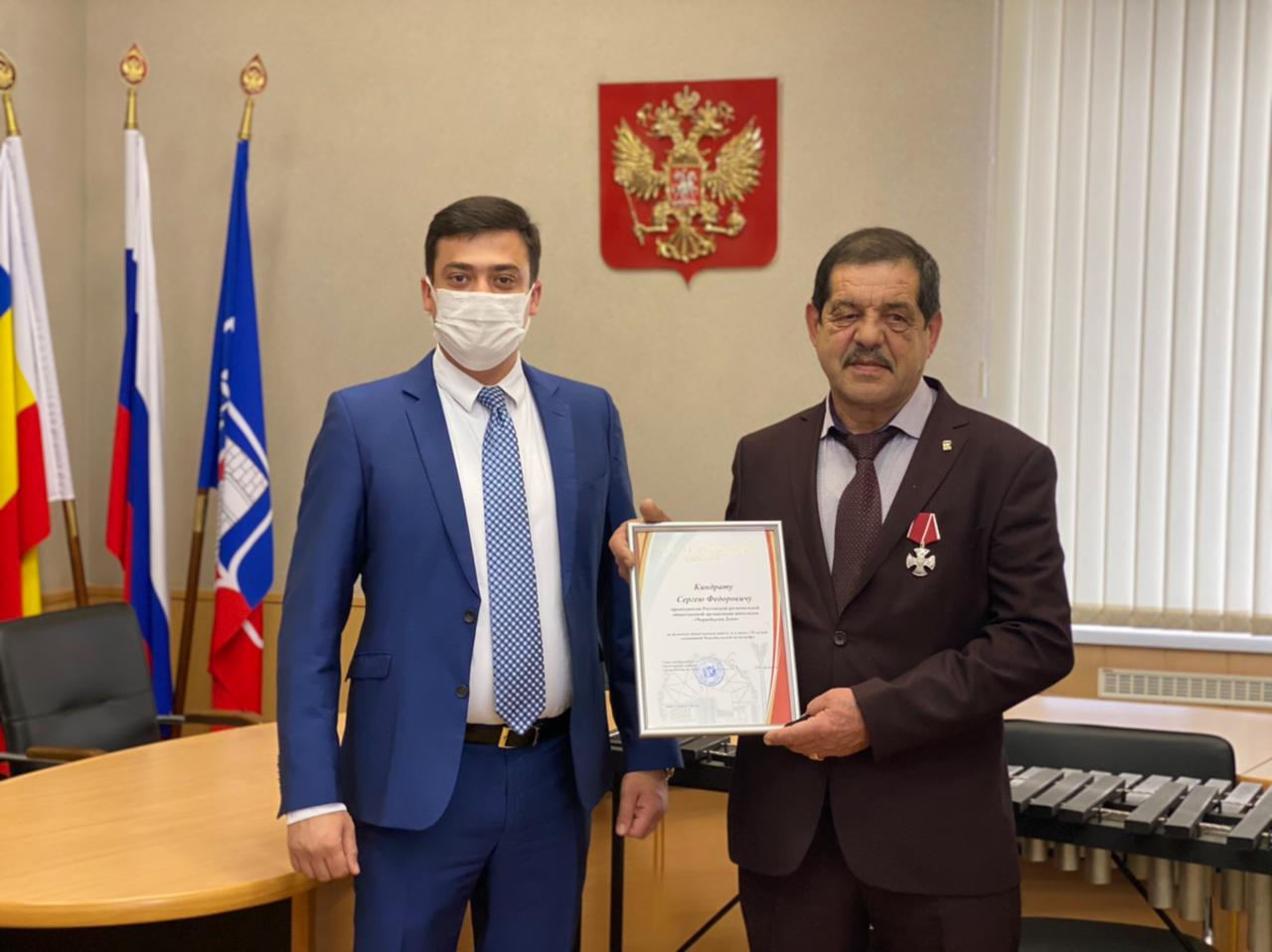 За участие в работе организации «Чернобылец Дона» по гражданскому и военно-патриотическому воспитанию молодежи и в связи с 35-летием аварии на Чернобыльской атомной станции глава администрации Е.Ю. Долматов получил из рук председателя РРООиЧД Киндрата С.Ф. Диплом почетного члена общественной организации, а депутат М.Х. Дирацуян и замглавы района Добринская В.В. - Почётные Грамоты и памятные юбилейные медали.
